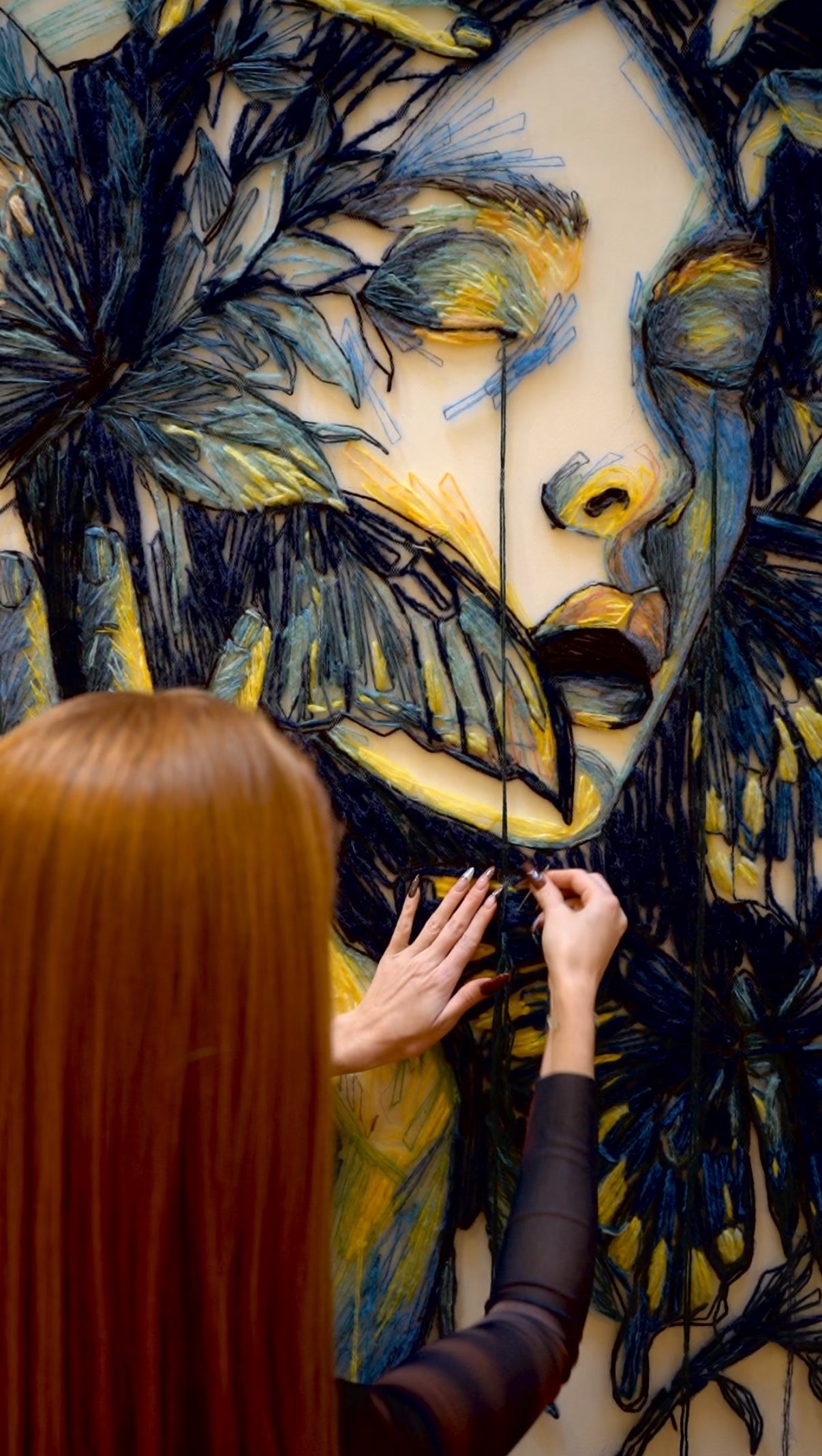 This piece reflects on the entanglement of human identity with the natural world. Threads suggest both confinement and release, echoing states of transformation.